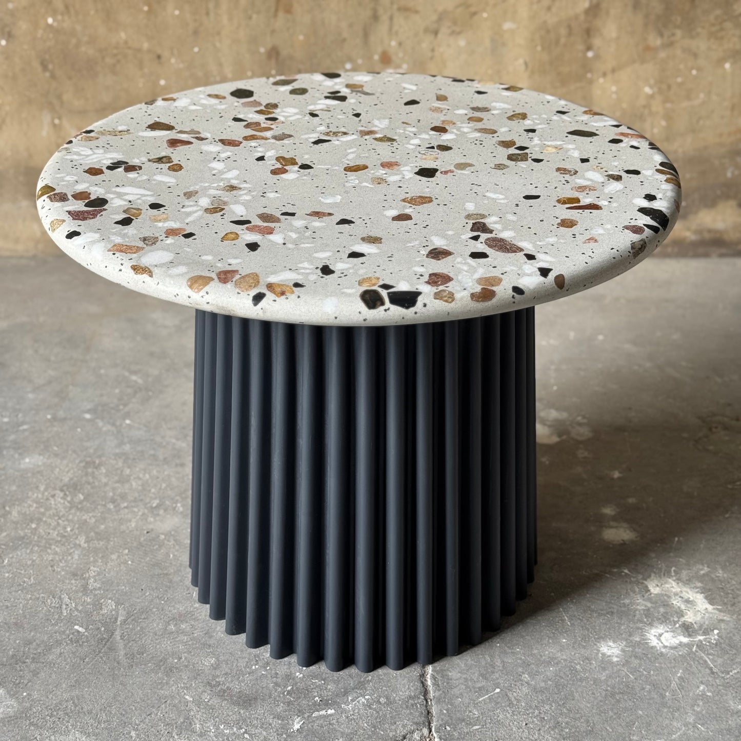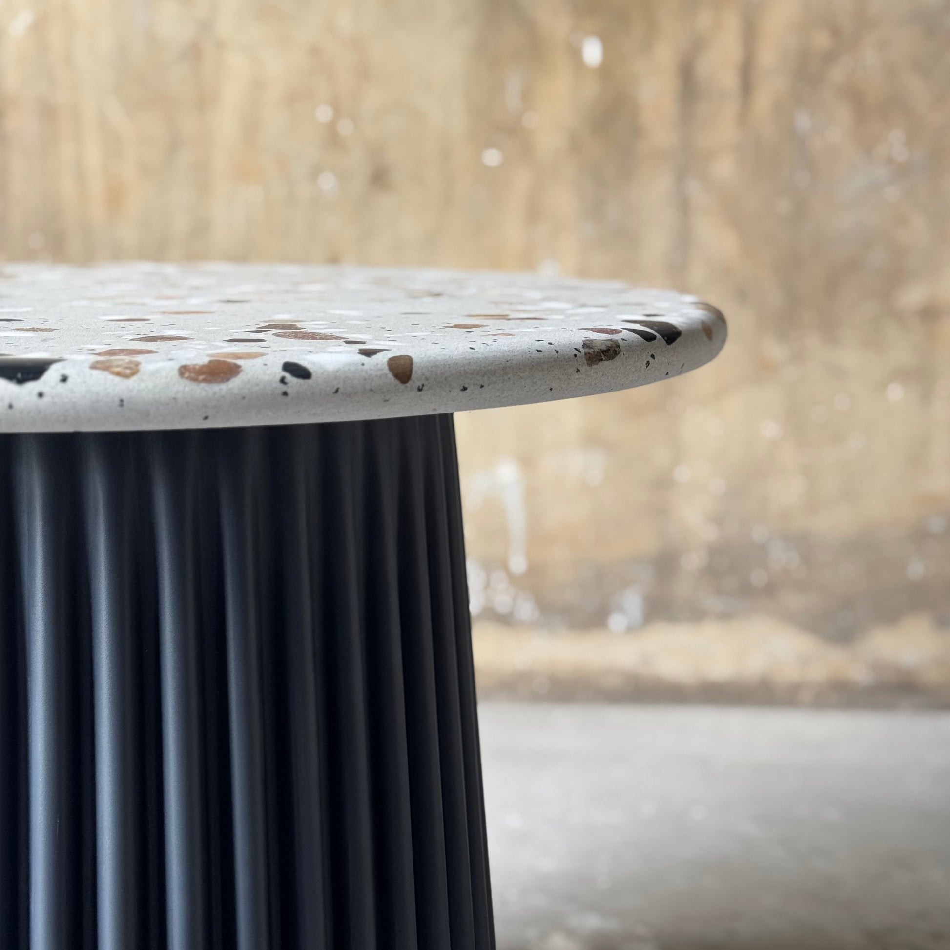 600mm round terrazzo top on a 100% polyethalene base, manufactured in South Africa.